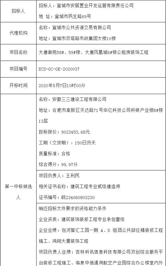大唐御苑58#、59#樓、大唐鳳凰城6#樓公租房裝飾工程中標(biāo)候選人公示